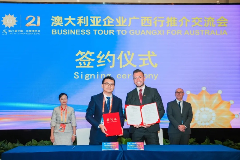9月24日,在廣西南寧舉辦的第21屆中國—東盟博覽會澳大利亞企業(yè)廣西行推介交流會上,廣西五礦集團所屬五礦資源公司與澳洲NEW START集團共同簽署鋁錠購銷意向協(xié)議,東博會秘書處秘書長韋朝暉、副秘書長梁藝光、澳大利亞駐廣州總領事康天幕見證簽約儀式。同時為就協(xié)議及合作事項進行深入磋商,雙方于25日召開座談會并達成系列意向共識。